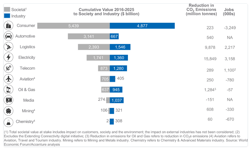 In 2015, the World Economic Forum created the Digital Transformation Initiative (DTI) to examine the impact of digital technologies on businesses and society. The DTI estimates that the net benefits will be greater than $100 trillion between 2016 and 2025.